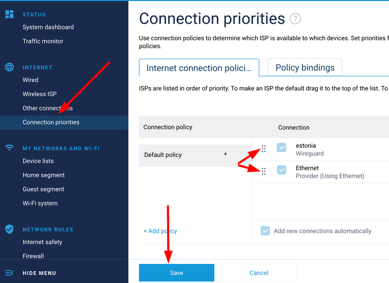 9. Abra el menú "Prioridades de conexión" y mueva la conexión VPN agregada a la parte superior para que tenga la máxima prioridad. Haga clic en "Guardar".