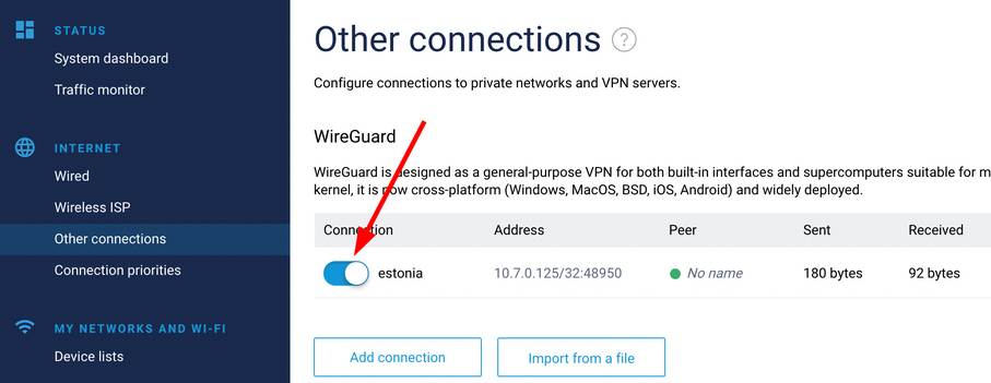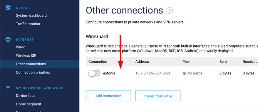 5. Abra nuevamente la interfaz del router, seleccione el menú "Otras conexiones". Haga clic en "Importar desde archivo" y seleccione el archivo obtenido del Configurador de WireGuard.