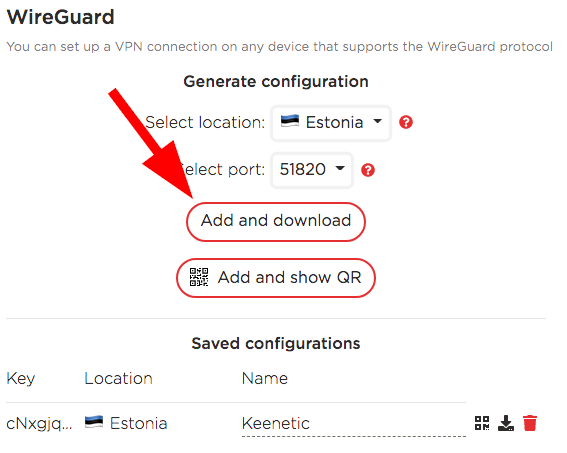 Luego seleccione la ubicación y el puerto al que desea conectarse y haga clic en "Agregar y Descargar".