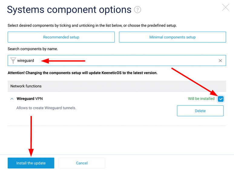 3. Escriba "wireguard" en la barra de búsqueda, marque la casilla junto a "WireGuard VPN" y haga clic en el botón "Instalar actualización".