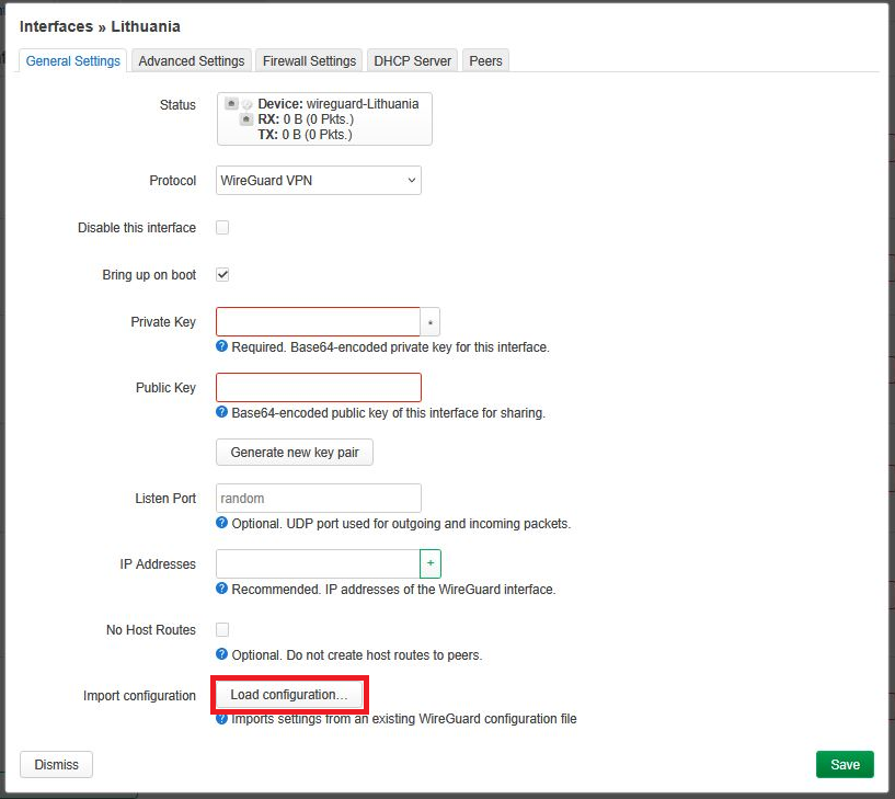 5. In the interface settings, click Load Configuration and paste the contents of the .conf file or upload the whole file.