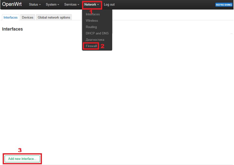 2. Open the router’s web interface in a browser: http://192.168.1.1 (or specify a different router IP) and go to: Network → Interfaces → Add new interface: