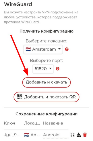Затем выберите локацию и порт, по которым вы хотите подключиться, и нажмите «Добавить и скачать».Чтобы не запутаться, подпишите сохранённую конфигурацию, например «Android».