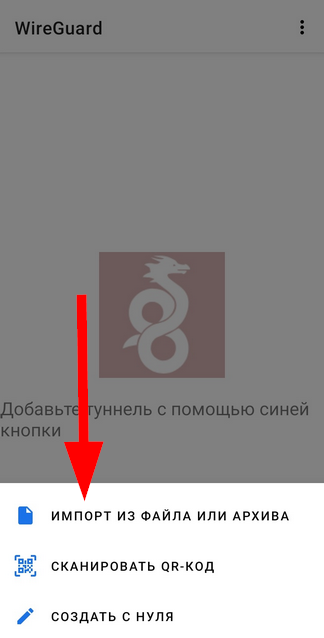 5. Выберите файл, который был скачан из конфигуратора WireGuard.