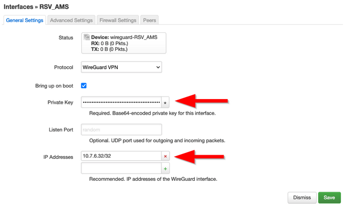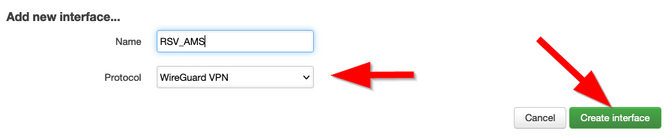 6. Назовите VPN-подключение, например «RSV_AMS» и выберите протокол - «WireGuard VPN». Затем нажмите «Create interface».