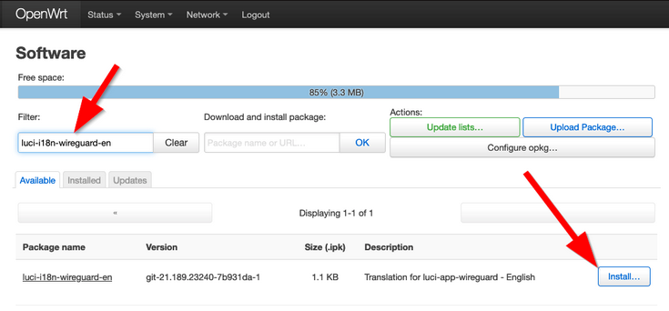 3. В поле «Filter» введите «luci-i18n-wireguard-en» и нажмите кнопку «Install» напротив найденного пакета. Все необходимые для работы WireGuard пакеты будут установлены вместе с ним.