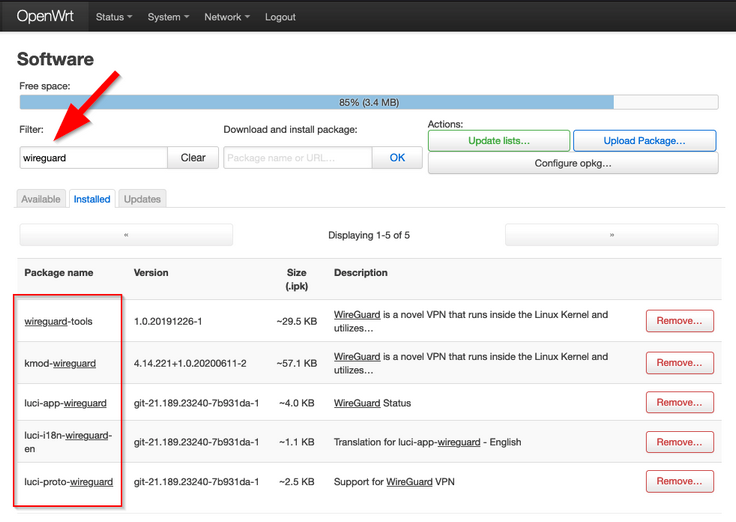4. Проверьте, что все необходимые пакеты установились: введите «wireguard» в поле «Filter».